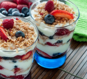 - Using a glass or jar, layer the parfait, starting with the “crust” at the bottom,then with strawberries, followed by the filling, and repeat two more times. Top with more strawberries and “crust” crumbles.